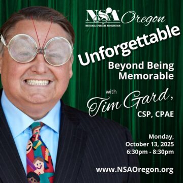 🎤 Don’t Miss Out – October 13th! @Tim Gard, CSP, CPAE, takes the NSA Oregon stage to show us how to go beyond memorable and become truly unforgettable as a speaker. Expect laughter, real-world tools, and stories you’ll take home and talk about long after the event. 📍 Hybrid Event (Portland + Online) 🕡 Doors open at 6:00 | Event 6:30–8:30 PM 🎟 Grab your ticket: https://nsaoregon.org/events/october-13-2025/ ✨ Whether you’re joining virtually or in-person, you’ll walk away inspired, energized, and equipped. #NSAOregon #TimGard #PublicSpeaking #SpeakerTips #Storytelling #NSAEvents #CommunityConnection #Inspiration #StagePresence (fb)