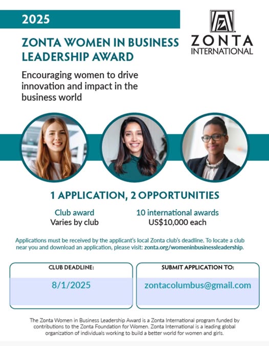 Are you a woman, aged 18-35 who demonstrates exceptional leadership in a business-related field of study or industry? If so, submit your application for the Zonta Women in Business Leadership Award to the Zonta Club of Columbus by August 1st. Details on the award can be found at the link provided below. (fb)
