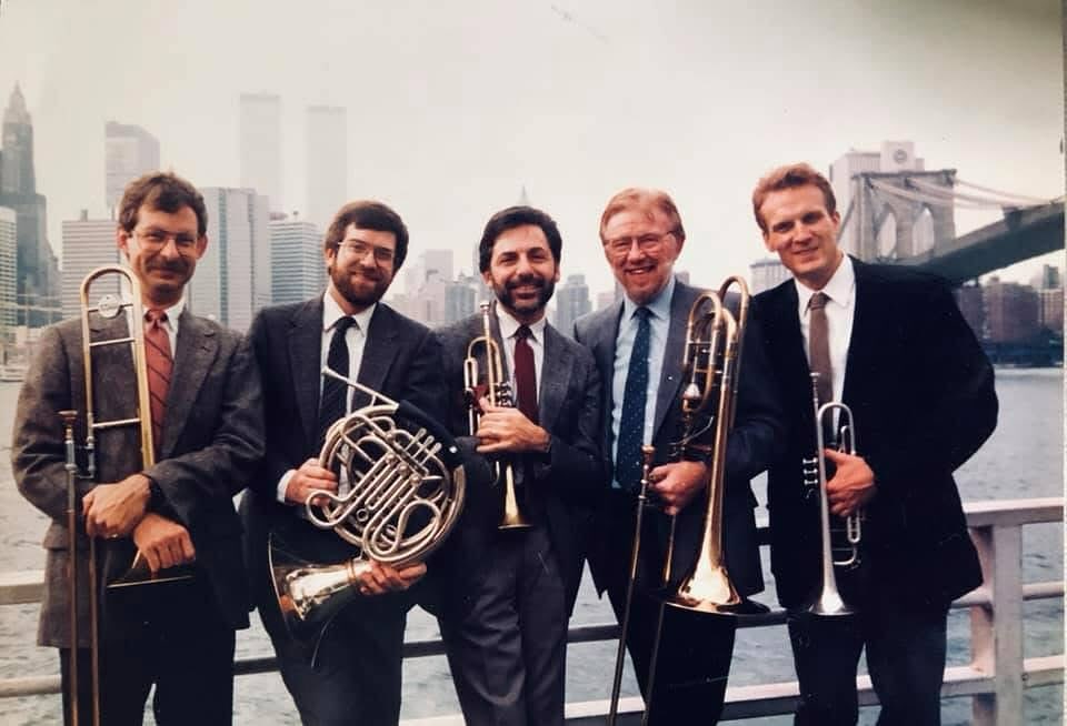 The ABQ family mourns the loss of one of our former members, bass trombonist Bob Biddlecome. Bob was a prominent member of the American Brass Quintet from 1963-1991. His contributions to not only to the quintet but to chamber music and the Aspen Music Festival have enhanced the lives of several generations of musicians. His legacy lives on with the current members as we remember his profound influence on the success of the ensemble. Bob just celebrated his 95th birthday on May 9th and was in contact with Ray Mase on that day. Picture left to right: Michael Powell, Dave Wakefield, Ray Mase, Bob Biddlecome & Chris Gekker. Photo taken in NYC around 1989, and yes, those are the two towers behind them. (fb)