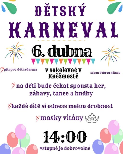 🎭 DĚTSKÝ KARNEVAL V KNĚŽMOSTĚ 🎭 TJ Sokol Kněžmost vás zve na dětský karneval plný zábavy, tance, her a hudby! 🎶🕺 📅 Kdy? 6. dubna 📍 Kde? Sokolovna Kněžmost ⏰ V kolik? 14:00 ✨ Každé dítě si odnese malou drobnost ✨ Pití pro děti zdarma ✨ Masky vítány! 👑🎭 Přijďte si užít skvělé odpoledne a nezapomeňte s sebou vzít dobrou náladu! 🌟 #DětskýKarneval #KarnevalKněžmost #TJ_Sokol #ZábavaProDěti (fb)