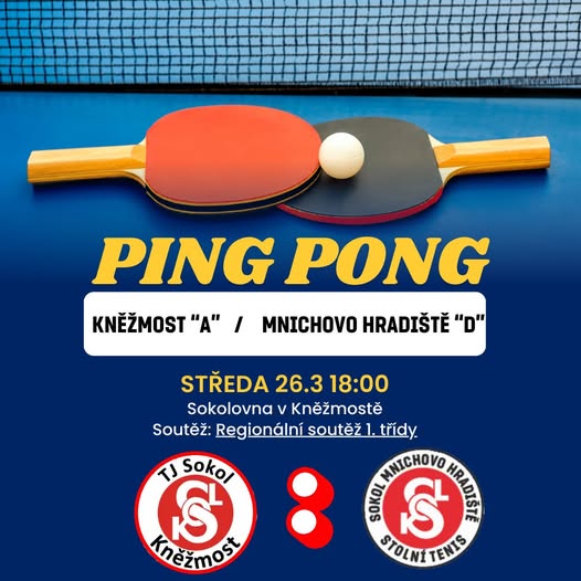 🏓 PŘIJĎTE PODPOŘIT NÁŠ TÝM! 🏓 Ve středu 26. 3. v 18:00 se v sokolovně v Kněžmostě odehraje napínavý zápas regionální soutěže 1. třídy mezi TJ Sokol Kněžmost A a Sokol Mnichovo Hradiště D! Za domácí nastoupí: 🔥 Šlapáček Martin 🔥 Koštál Marek 🔥 Sychra Martin 🔥 Macek Jaroslav Za hosty pravděpodobně: ⚡ Černovský Pavel ⚡ Kracman Martin ⚡ Dlask Ladislav ml. ⚡ Janatka Aleš Přijďte vytvořit skvělou atmosféru a pomoct našemu týmu k vítězství! Každý hlas a potlesk se počítá! 🔥🏓 #PingPong #SokolKněžmost #DomácíZápas #Fandíme (fb)