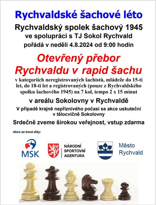 V neděli 4.8. 2024 pořádáme od 9:00 v areálu Sokolovny Rychvald šachový turnaj tempem 2 x 15 minut na partii. Srdečně zveme širokou veřejnost, aby si přišla zahrát o věcné ceny! (fb)
