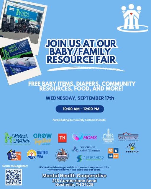 Join us for our first-ever Resource Fair at Mental Health Cooperative in partnership with Mother to Mother! 📅 Date: Wednesday, September 17th 🕙 Time: 10:00 AM – 12:00 PM 📍 Location: 275 Cumberland Bend, Nashville, TN 37228 ✨ What to Expect: Free supplies for mothers (strollers, baby items, diapers, food & more) Access to community resources and services On-site partners ready to connect you to vital support ✅ Registration is required! Click here to sign up: https://forms.office.com/r/qcjn3j5550 We can’t wait to see you there! (fb)