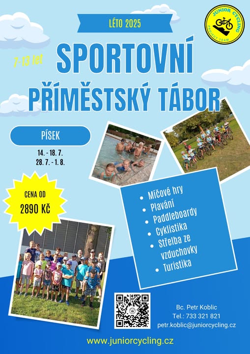 Junior cycling projekt team – přidej se, bude to zábava Junior cycling projekt team – přidej se, bude to zábava Nabíráme nové talenty Do našich týmů v Písku, Českých Budějovicích, Strakonicích a Blatné právě nabíráme nové talenty. Pořádáme cyklistické závody Každoročně pořádáme několik závodů pro všechny sportovní kategorie. MTB, cyklokros i dětské závody. Pořádáme příměstské tábory O prázdninách, v červenci i srpnu, pořádáme dětské sportovní příměstské tábory v Písku a Strakonicích.