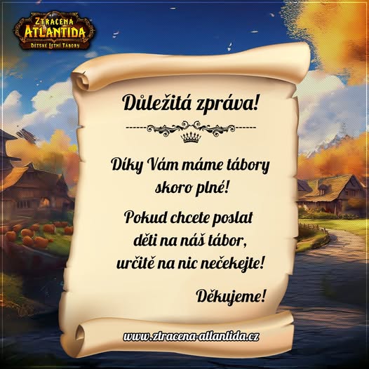 Mockrát děkujeme, jste úžasní ❗️😇 Volná místa mizela tak rychle, že jsme nestíhali klikat, mrkat a ani dýchat 😃. Pár míst jsme přidali, tak zkuste své rychlé prsty a štěstí. 🍀. 👉Pokud na vás nevyšlo místo, nezoufejte... stále nám můžete napsat na 📧tabor@zicherka.cz , abychom vás zařadili mezi náhradníky, a jakmile se něco uvolní, tak hned dáme vědět. Věř, že: "Naděje umírá poslední."😉 Těšíme se na tebe❗🤩 #ZtracenaAtlantida #LetníTábor #Dobrodružství (fb)
