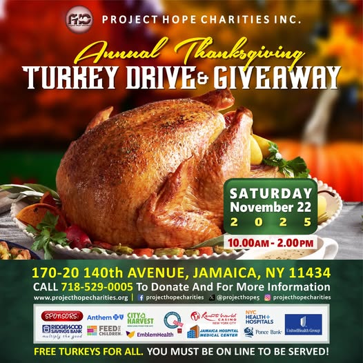 Our 𝗔𝗻𝗻𝘂𝗮𝗹 𝗧𝗨𝗥𝗞𝗘𝗬 𝗗𝗥𝗜𝗩𝗘 & 𝗚𝗜𝗩𝗘𝗔𝗪𝗔𝗬 takes place on 𝗦𝗔𝗧𝗨𝗥𝗗𝗔𝗬, 𝗡𝗢𝗩𝗘𝗠𝗕𝗘𝗥 𝟮𝟮 𝗧𝗜𝗠𝗘: 𝟭𝟬.𝟬𝟬𝗮𝗺 - 𝟮.𝟬𝟬𝗽𝗺. Please feel free to come around and pick up your turkeys and other food items. 𝗬𝗢𝗨 𝗠𝗨𝗦𝗧 𝗕𝗘 𝗢𝗡 𝗟𝗜𝗡𝗘 𝗧𝗢 𝗕𝗘 𝗦𝗘𝗥𝗩𝗘𝗗! Tell someone to tell someone. #turkey #giveaway #thanksgiving #newyork #jamaica #queens #newyorkcity (fb)