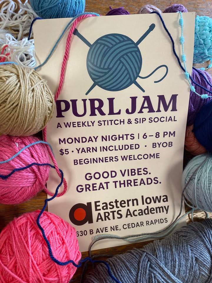 Join us for our FIRST Purl Jam on Monday! Purl Jam is a weekly stitch-and-sip social hosted at the Eastern Iowa Arts Academy. Join us every Monday night from 6 to 8 PM at 2630 B Ave NE for a cozy evening of knitting, crocheting, and community. No need to register, just bring $5 at the door! We’ll provide the yarn, tools, and a warm, welcoming space to relax and create. Come for the crafting, stay for the conversation.! (fb)