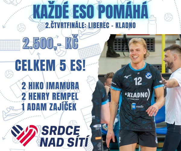 🏐💙 KAŽDÉ ESO POMÁHÁ Díky 5 esům našich Eagles během včerejšího 2.čtvrtfinále play off ČEZ volejbalová extraliga muži přispějeme pro nadaci Srdce nad sítí 2.500,- Kč! 💪 Kolik tipujete, že přidáme v pátečním domácím zápasu? Přijďte fandit do Kladenské sportovní haly! 🔥 (fb)