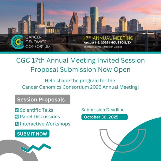 Help shape the program for the Cancer Genomics Consortium 2026 Annual Meeting! The Cancer Genomics Consortium is soliciting proposals for invited sessions for the 17th Annual Meeting in Houston, TX. #CGCAnnual2026 #genomics #cancer #research #genetics #clinicaltesting #bioinformatics #cytogenetics #molecular (fb)