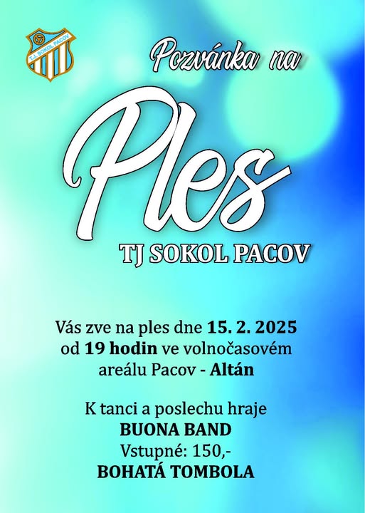 Zveme Vás na ples TJ Sokol Pacov, který se koná 15. 2. 2025 od 19 hodin ve volnočasovém areálu Pacov - Altán. Těšíme se na Vás 🎉🥳 (fb)