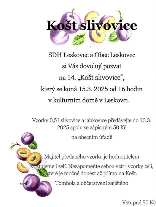 SDH Leskovec a Obec Leskovec zvou na 14. ročník „Koštu slivovice“, který se koná tuto sobotu 15. března 2025 od 16 hodin. (fb)