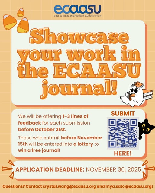 ECAASU 🫵 WANTS 🫵 YOUR WORK‼️ Looking for free feedback and free submission? We got you this spooky season !! 🎃👻 Submit to the ECAASU journal before October 31st and you will receive 1-3 lines of feedback for your prose, poetry, and/or multimedia art piece. You will also be entered into a lottery to receive a FANTASTIC copy of our final journal (which may include YOUR piece) if you submit before November 15th. Interested in submitting your work? You can screenshot our post and click on the QR code! The link is also available in the LinkTree in our bio. We look forward to seeing your submissions!🤗🤗 (fb)