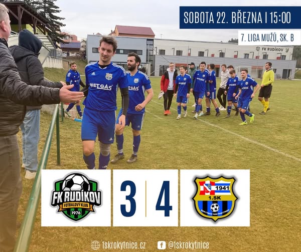 Uuu, tak tohle bylo drama!🥵💙🎉 V prvním jarní utkání jsme na hřišti Rudíkova šli o poločase do kabin s vedením 0:4, kdy se dvakrát prosadil Šimon Vladeka5️⃣🚀 a po jedné trefě Milan Dufek7️⃣💥 a Radek Ferkl9️⃣⚽️. Domácí mančaft ale nesložil zbraně a v druhém dějství dokázal hned třikrát snížit👀. Naštěstí pro nás jednobrankové vedení vydrželo, a my tak vstupuje do jara se ziskem tří bodů!✅💪💙 (fb)