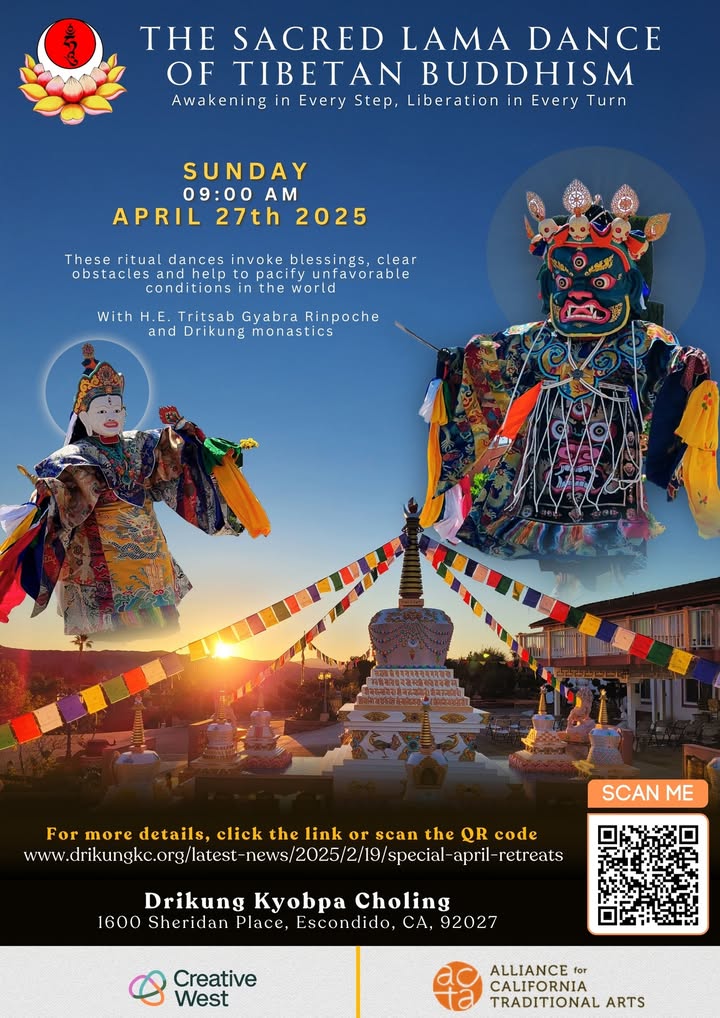 We are pleased to announce the 2025 Lama Dances at DKC. We are also happy to share about a special project we have begun to help us in the preservation, documentation and digital archive of these precious and sacred Tibetan Buddhist dances also referred to as Chams. We received some funding for this project which has been made possible in part, by a grant from the Alliance for California Traditional Arts, in partnership with the California Arts Council, a state agency, the Walter & Elise Haas Fund, and the William and Flora Hewlett Foundation. We will post more updates about the digital archive project as it becomes available. We hope you can join us in person on April 27th. We also hope to Live Stream on Facebook (portions) of this special event. May all be auspicious ! (fb)