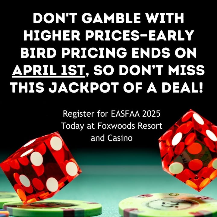 😬😬😬 It's already last call for early bird pricing. Don't miss out on the registration savings! If you come each year, what are you waiting for? If you haven't been in a few years, we won't hold it against you (as long as you come this year), and if you've never been to the conference, it's a phenomenal year to go to your first one, with special pricing for first-time attendees! Some might say that's already hittin' the jackpot.🎰🎰🎰 www.easfaa.org/annual-conference (fb)