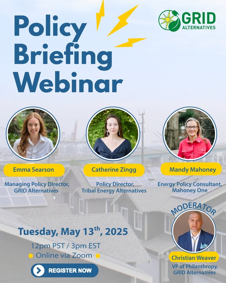 YOU are invited to join us for our Policy Briefing Webinar on Tuesday, May 13th! 💡💭 We will be featuring three exciting guests — GRID's Managing Policy Director, Emma Searson, Tribal Energy Alternatives' Policy Director, Catherine Zingg, and energy policy consultant, Mandy Mahoney. Join us on Zoom for an afternoon in discussion on energy policy in today’s dynamic landscape. You won't want to miss this! We hope you can attend! Register at https://tinyurl.com/policybriefingwebinar (fb)