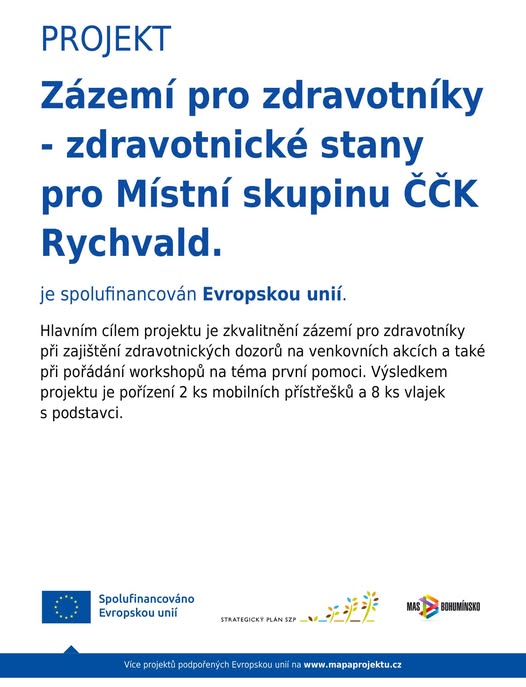 Pomáháme regionu – společně rozvíjíme nápady, společně měníme naše okolí Tento projekt byl realizován s podporou Místní akční skupiny Bohumínsko, z.s., která dlouhodobě propojuje obce, neziskové organizace, školy, podnikatele i obyvatele se zdroji a příležitostmi, jak zlepšovat život v našem regionu. Díky tomu v regionu vznikají konkrétní věci: * zmodernizované školy, * upravená veřejná prostranství, * podpora podnikání a zemědělství, * investice do péče o krajinu, * komunitní a kulturní aktivity – a mnoho dalšího. MAS Bohumínsko působí v těchto obcích: Bohumín, Dolní Lutyně, Dětmarovice, Doubrava, Petrovice u Karviné, Petřvald a Rychvald. Díky MAS Bohumínsko se podařilo uskutečnit i náš projekt: „ZÁZEMÍ PRO ZDRAVOTNÍKY – ZDRAVOTNICKÉ STANY PRO MÍSTNÍ SKUPINU ČČK RYCHVALD.“ Více informací naleznete na www.masbohuminsko.cz a FB MAS Bohumínsko. (fb)