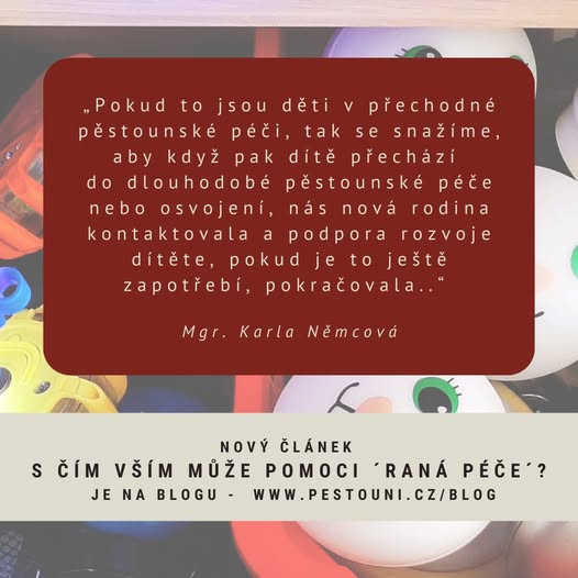 @sledující 👶💙 Raná péče pomáhá dětem i rodinám V České republice existuje přibližně 30 organizací poskytujících ranou péči. Podporují rodiny s dětmi se zrakovým, mentálním či kombinovaným postižením, s poruchami autistického spektra, ADHD nebo třeba s opožděným psychomotorickým vývojem. Pomoc mohou využít i pěstounské rodiny. Jedinou podmínkou je věk dítěte do 7 let. 👀 Mezi nejstarší organizace patří Společnost pro ranou péči, která se specializuje na děti se zrakovým a kombinovaným postižením. Pobočky má po celé ČR, včetně dvou v Olomouci – jedné "pro zrak" a druhé pro rodinu. Jak probíhá jejich práce? O tom jsme si povídali s Mgr. Karlou Němcovou z brněnské pobočky. 📖 Více v článku 👉 https://www.pestouni.cz/blog-clanky/s-cim-vsim-muze-pomoci-rana-pece/ #RanáPéče #DítěSPostižením #PěstounskáPéče #ZrakovéVady #MentálníPostižení #FunkčníVyšetřeníZraku #PředčasněNarozenéDítě #KombinovanéPostižení (fb)
