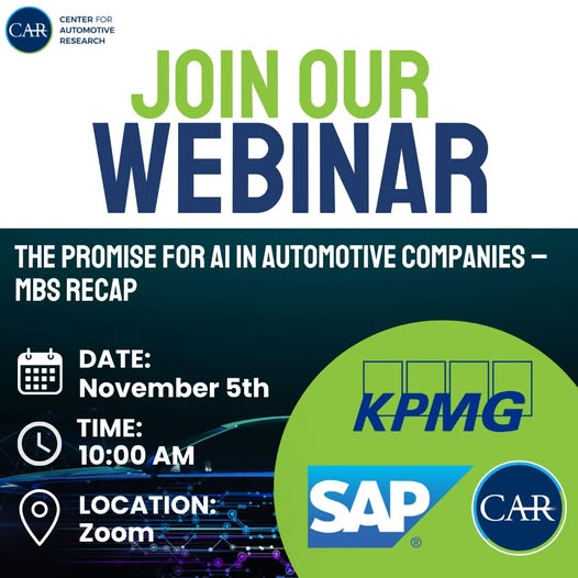 Join Bill Newman, Rich Wilkins, and Andrea Haupfear of SAP America, Elle Whittaker of CAR, and Hernan De la Torre of KPMG as they revisit insights from #MBS25 and dive deeper into how AI is reshaping the automotive landscape. From distinguishing AI’s real potential vs. hype to exploring how Agentic AI is redefining business processes, this session will unpack where the technology is truly delivering value—and what’s next for the industry. 🔹 See where AI is making a measurable difference 🔹 Get insights on future adoption and innovation 🔹 Learn how to approach AI governance and trust-building Register here: https://us06web.zoom.us/webinar/register/WN_l4ONbfZfReiGsMB3eGxoDQ (fb)